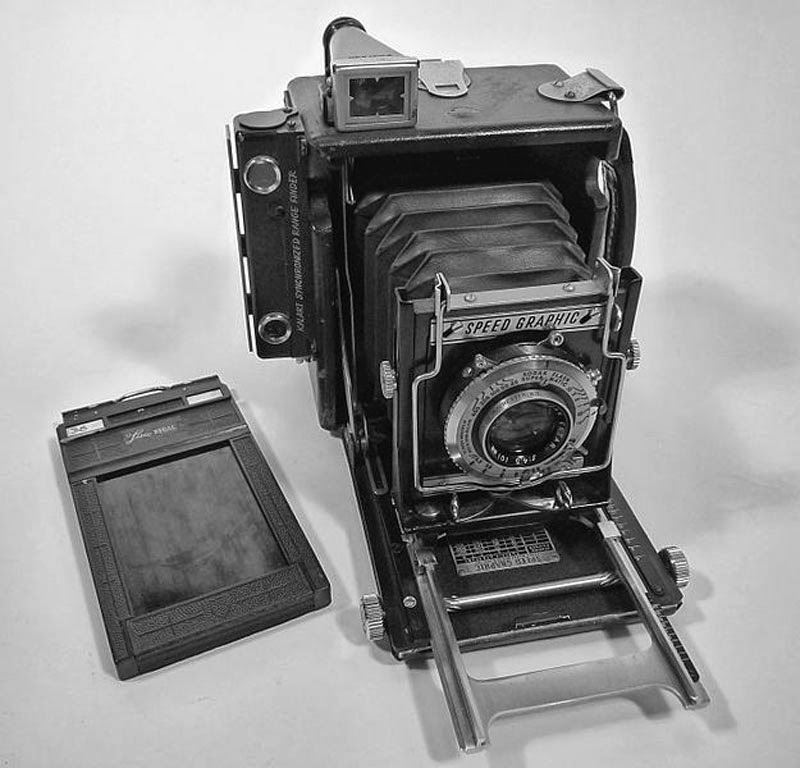 The classic medium 4x5 format Speed Graphic camera - more details are still in the negatives...