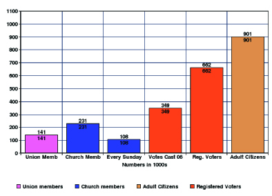 In the November 7, 2006 General Election 662,728 registered voters were eligible to participate. 52.7% actually cast ballots. If one assumes that 80% of union members turned out at the polls and 80% of them voted Democrat, the following numbers result: