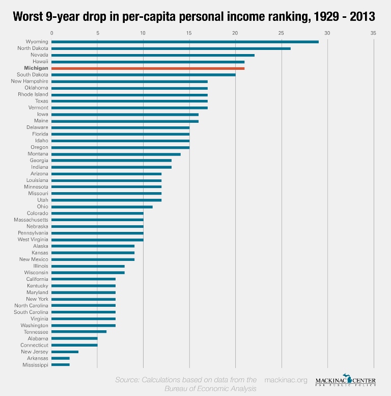 Per-capita personal income in the state fell from 5th highest in the U.S. in 1992 to 26th place in 2001; this relative decline was the fourth largest for any state during a nine-year period going back to 1929.