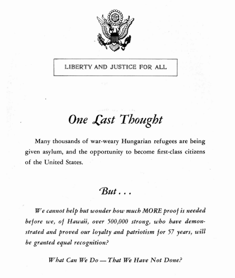 According to one statehood opponent, the very idea of statehood was “preposterous,” since people of Japanese descent in Hawaii held allegiance to Japan, “which they could not disavow if they would, and would not if they could.”