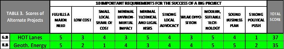 The scores for HOT Lanes and Better Energy are shown in Table 3 below. These are good projects that should get done!